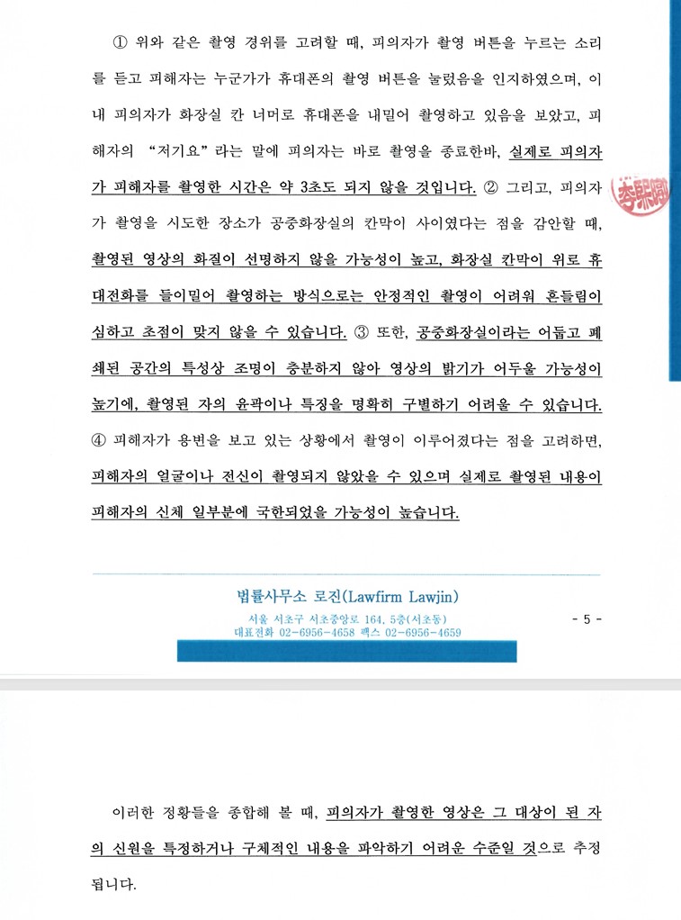 본 사건은 의뢰인이 화장실에 들아가 용변을 보고 있는 피해자를 위에서 촬영하다가, 피해자에게 걸렸고, 피해자가 신고를 하여 경찰이 오게 된 사건이었습니다. 의뢰인은 경찰이 왔을 때, 본인의 휴대폰 사진을 삭제한 후 휴대폰을 경찰에게 확인시켜줬고, 혐의 사실을 부인하여 조사일정이 잡힌 상황이었습니다. 의뢰인은 초동조치를 잘하여 휴대폰을 임의제출하지 않은 상황이었습니다.