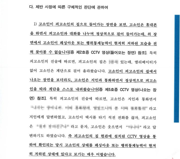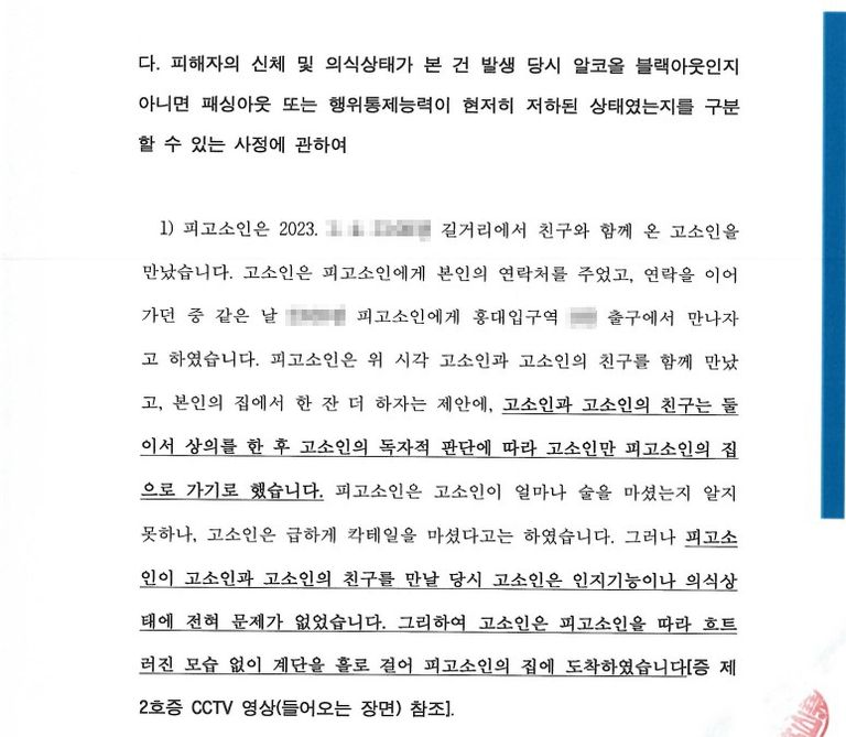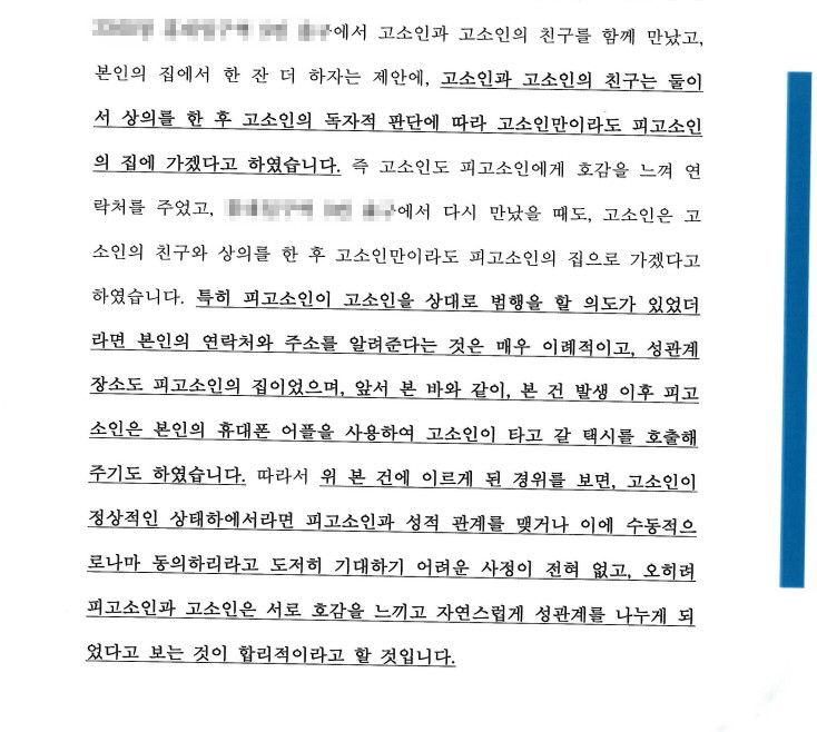 본 건은 의뢰인이 홍대역 인근을 지나다가 호감을 갖게된 여성을 만나 헌팅을 한 후 본인의 집에서 성관계를 하였다가 준강간으로 조사를 받게 된 사안이었는데요. 의뢰인에게 먼저 당시 상황을 타임라인에 맞춰 세부적으로 작성해줄 것을 요청하였습니다. 그리고 확보한 CCTV와 고소인과 주고받은 메시지 내용 및 녹음파일을 근거로 위 대법원의 판시 내용에 따라 세부적으로 논증을 한 변호인의견서를 제출하였고, 사건은 검찰까지 가지도 않고 경찰 단계에서 불송치로 종결되었습니다.