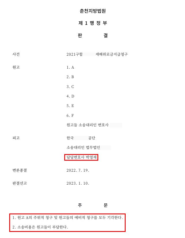 ⑤판결 : 법원은 폐광지원 대상 광산 근무 사실만으로는 재해위로금 지급대상에 해당한다고 볼 수 없고, 이 사건에서는 망인의 I탄광 근무로 진폐증이 악화되었다고 인정하기 부족하다고 보아, 원고 A의 주위적 청구 및 원고들의 예비적 청구를 모두 기각하였습니다. 그 결과 의뢰인(피고)은 재해위로금 지급의무를 부담하지 않게 되었습니다.