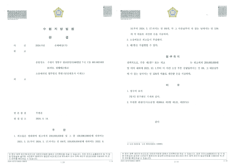본 사건은 아트테크 투자 구조를 이용한 사기 사안에서 계약관계와 투자금 지급 내역을 체계적으로 정리하여 손해배상청구 전부 인용 판결을 받아낸 사례입니다.