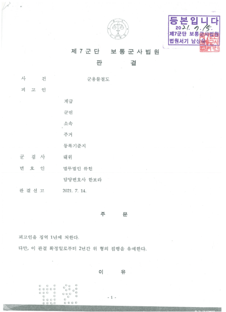 이 사건은 군용물인 경유 약 71L를 절취하였다는 혐의로 기소되어 중한 처벌이 예상되던 사안이었습니다. 특히 범행 직후 상황을 목격한 증인이 존재하였고, 의뢰인이 수사기관에서부터 범행을 부인한 사정도 있었던 사건이었습니다.