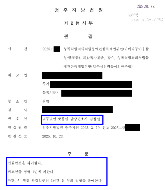 다만, 1심에서 자백했던 카메라이용촬영죄는 그대로 유죄로 인정되어 집행유예 판결이 선고되고 말았습니다.
