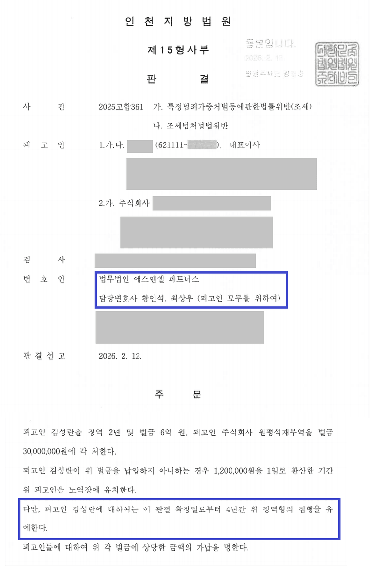 지난 2/12 재판부는 의뢰인의 유죄를 인정하여 징역 2년 및 벌금 6억원에 처하면서도