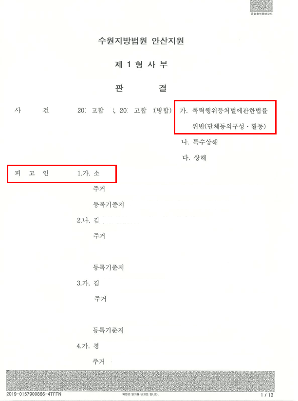 의뢰인은 폭력행위등처벌에관한법률위반(단체등의 구성·활동) 혐의로 다수의 공범들과 함께 기소되었습니다. 특정 지역 폭력조직(○○파) 가입 사건으로, 법원이 대부분의 피고인에게 유죄를 선고한 중대한 형사사건이었습니다.