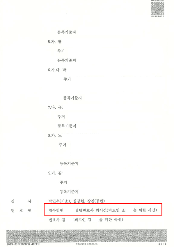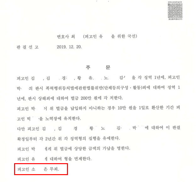 함께 기소된 8명의 공동피고인들은 차례차례 징역형·집행유예·벌금 유죄판결을 받았습니다. 그런데 공동피고인 9명 중 단 한 명만 무죄를 받았습니다.