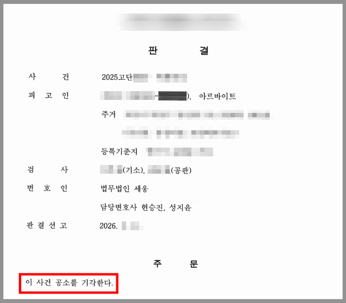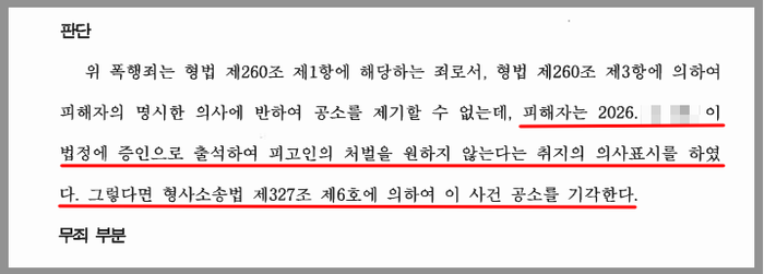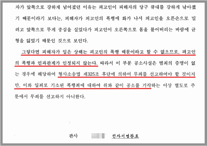 법원에서는 변호인의 변론을 모두 받아들여 피해자의 상해는 W가 큐대를 잡아당긴 행위와 인과관계가 인정되지 않는다는 이유로 무죄를, W가 피해자의 큐대를 잡아당긴 행위에 대해서는 피해자의 처벌불원의사가 있었으므로 공소기각을 선고하였습니다.