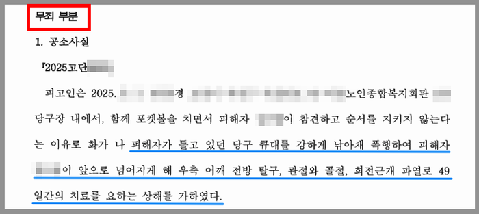 W는 은퇴 후 아르바이트로 소일거리를 하면 지내는 60대 후반의 노인이었습니다. W는 거주지 인근의 노인복지관에 있는 당구장에서 종종 다른 노인들과 포켓볼을 즐겼는데, 어느 날 게임 중 80대 노인과 다툼이 생겼습니다. 이 과정에서 W는 피해자가 들고 있던 큐대를 잡아당기는 행동을 했고, 수사기관에서는 이 행위로 인해 고령의 피해자가 바닥에 넘어져서 전치 7주의 진단을 받고 수술과 입원치료를 받았다고 보아 W를 폭행치상 혐의로 재판에 넘겨졌습니다.