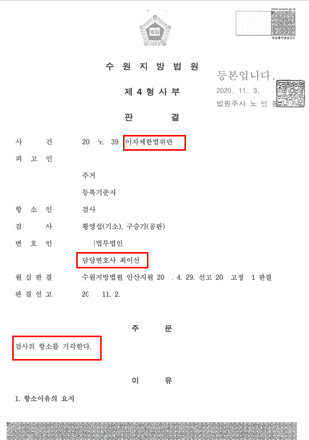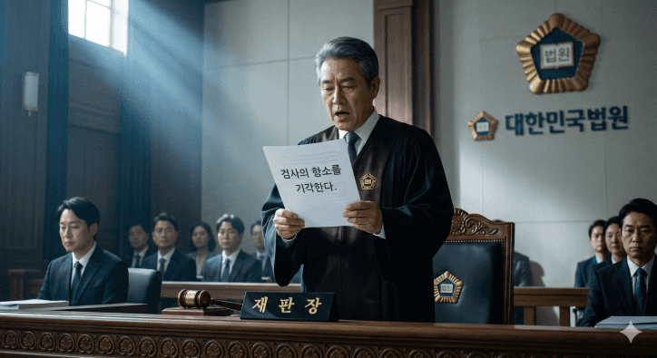 그리고 마침내 다가온 선고일. 수원지방법원 제4형사부는 짧고 단호하게 주문을 낭독했습니다.