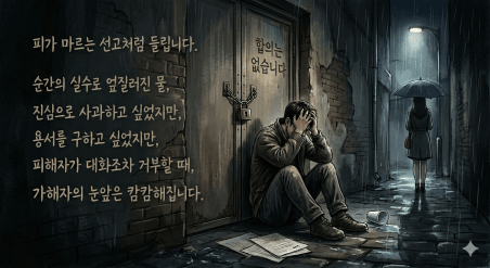 "선생님, 가해자를 변명하려고 전화드린 것이 아닙니다. 동네 한복판에서 얼마나 큰 수치심과 충격을 받으셨을지... 그 억울하고 참담한 심정을 제가 선생님 편에 서서 끝까지 다 듣고 싶습니다. 욕을 하셔도 좋으니, 마음속에 맺힌 응어리를 제게 다 쏟아내 주십시오."