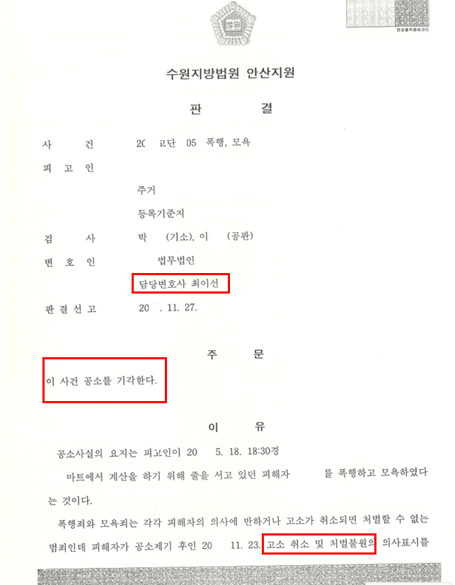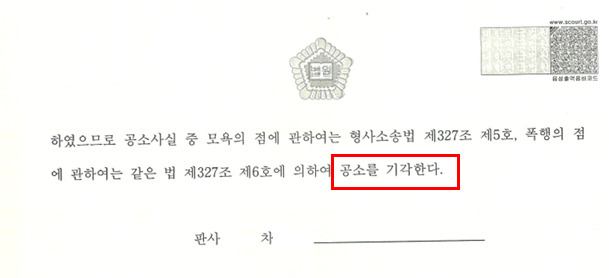 판결 선고를 불과 4일 앞둔 11월 23일, 기적적으로 피해자는 법원에 고소 취소 및 처벌불원의 의사표시를 접수했습니다. 이에 법원은 공소를 기각하는 판결을 내렸습니다.