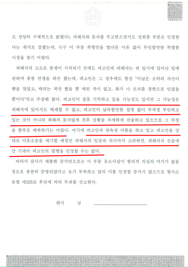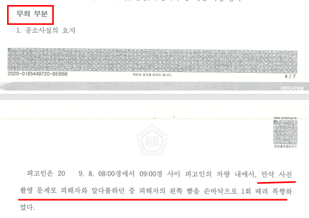 말이 바뀌는 주변 정황: 아내는 "뺨을 맞았다"는 주장은 지켰지만, 그 외의 사실관계에서는 계속해서 모순을 드러냈습니다. 수사기관에서는 "남편을 주먹으로 한 대 쳤다"고 스스로 인정해놓고, 법정에서는 "전혀 때린 적이 없다"고 말을 번복했습니다. 본인에게 불리한 과격한 행동이나 폭언에 대해서는 "장난식이었다"며 교묘하게 축소하기 급급했습니다.
