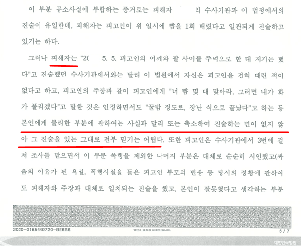 재판부는 폭행에 대한 피해자의 진술이 일관되더라도, "본인에게 불리한 부분에 관하여는 사실과 달리 또는 축소하여 진술하는 면이 없지 않아 그 진술을 있는 그대로 전부 믿기는 어렵다"고 판시했습니다. 또한 이혼과 양육권 다툼을 앞둔 피해자의 이해관계까지 고려하여, 피해자의 진술만으로는 유죄를 인정할 수 없다고 명확히 결론 내렸습니다.