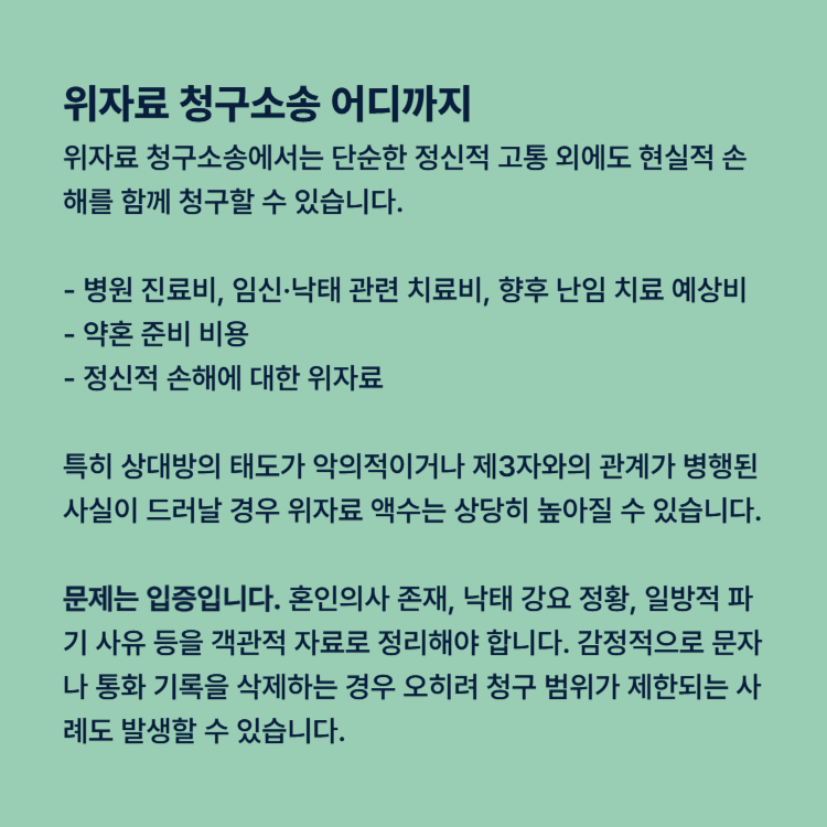 문제는 입증입니다. 혼인의사 존재, 낙태 강요 정황, 일방적 파기 사유 등을 객관적 자료로 정리해야 합니다. 감정적으로 대응하다가 문자나 통화 기록을 삭제하는 경우 오히려 청구 범위가 제한되는 사례도 발생하고 있습니다.