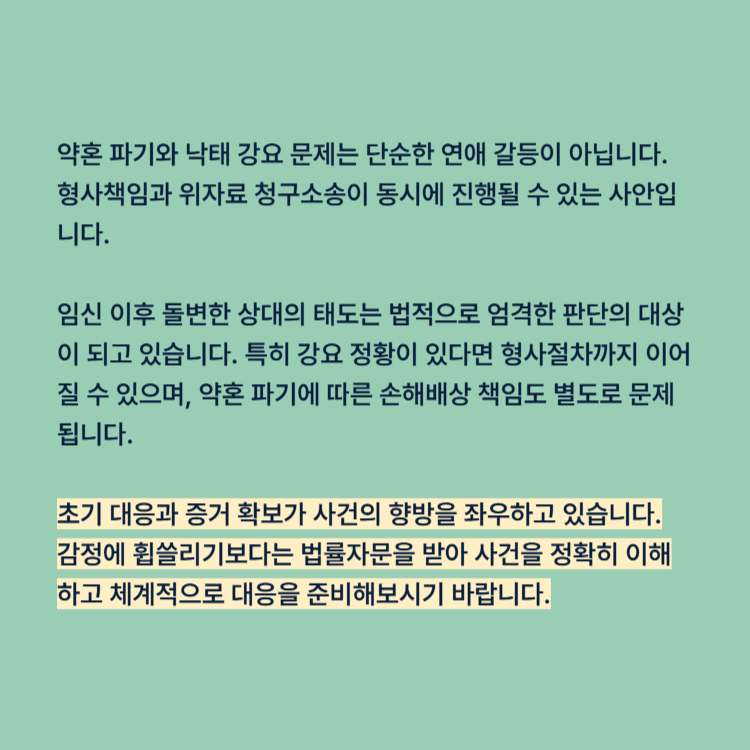 임신 이후 돌변한 상대의 태도는 법적으로 엄격한 판단의 대상이 되고 있습니다. 특히 강요 정황이 있다면 형사절차까지 이어질 수 있으며, 약혼 파기에 따른 손해배상 책임도 별도로 문제 됩니다.
