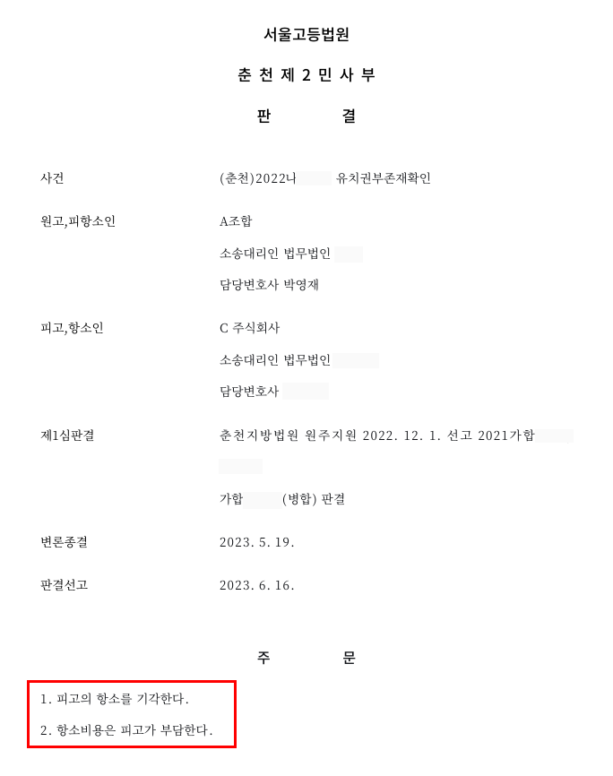 ⑤판결 : 항소심 법원은 제1심의 사실인정과 판단이 모두 정당하다고 보아 피고의 항소를 기각하였습니다. 이에 따라 의뢰인(원고, 피항소인)이 구한 유치권부존재 확인이 확정적으로 인정되어, 이 사건 각 부동산에 관한 피고의 유치권 주장은 받아들여지지 않았습니다.