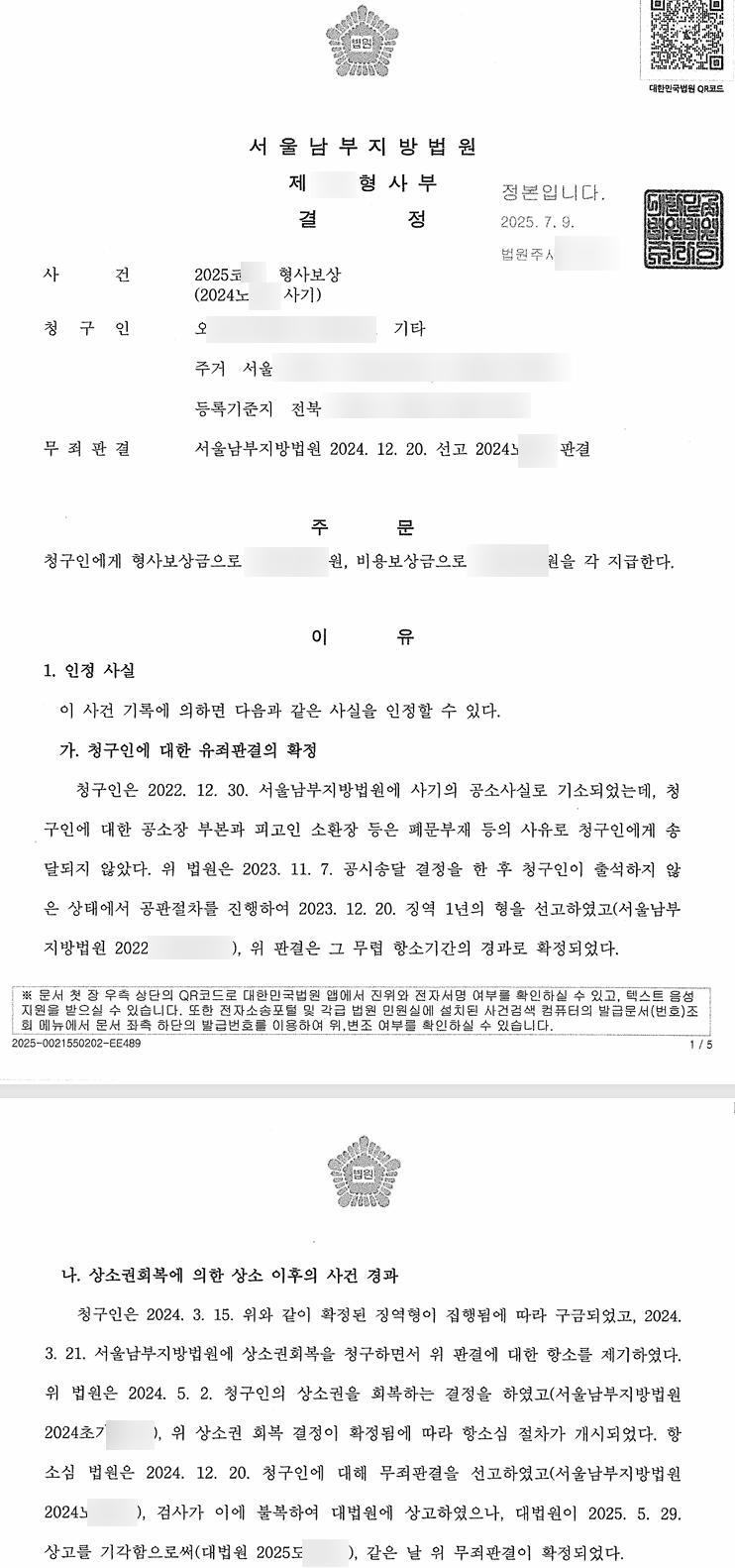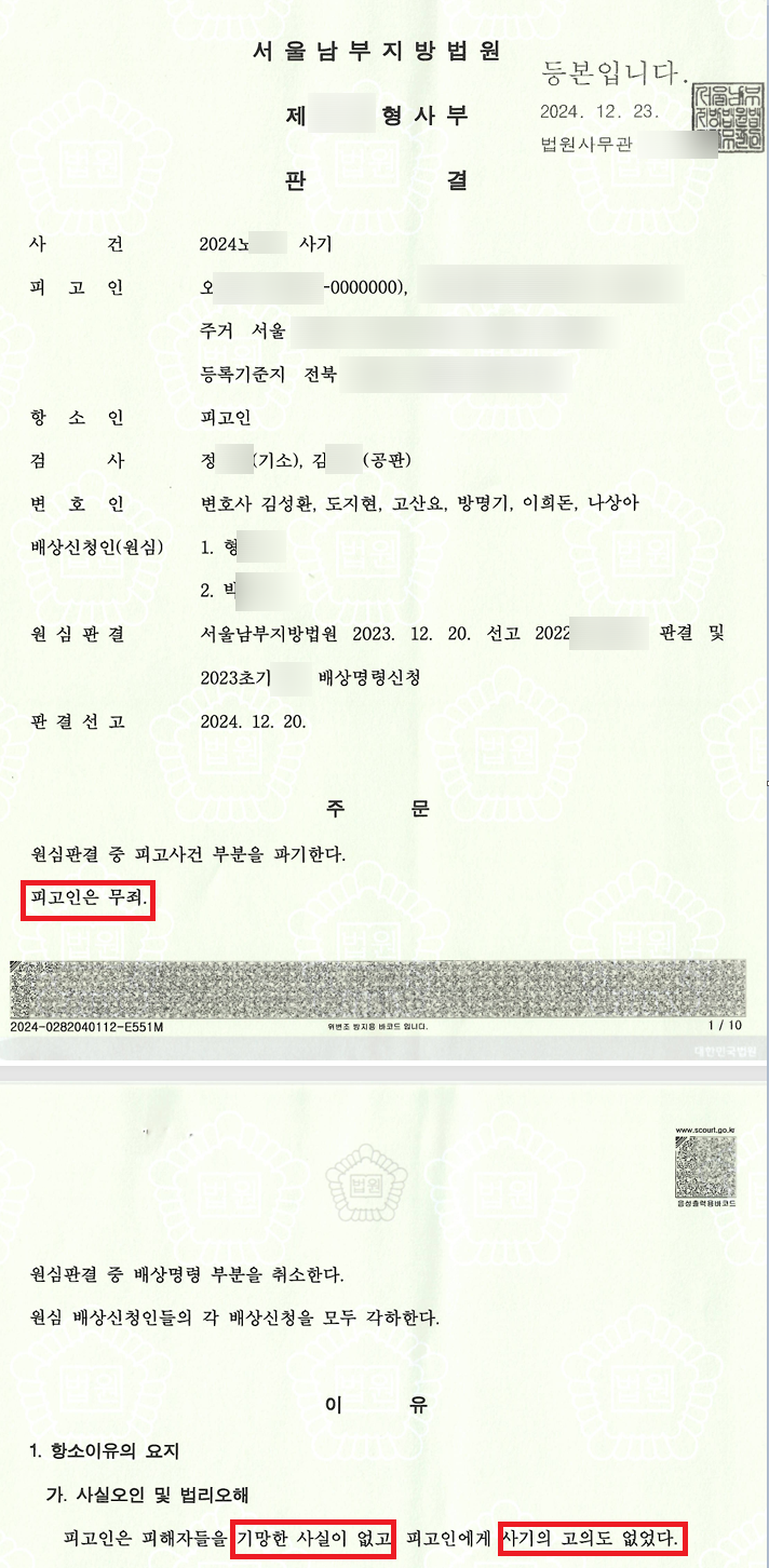 [성공사례] - 상소권회복청구인용, 사기 항소심 무죄, 대법원 무죄, 형사보상청구 7천만원 인용