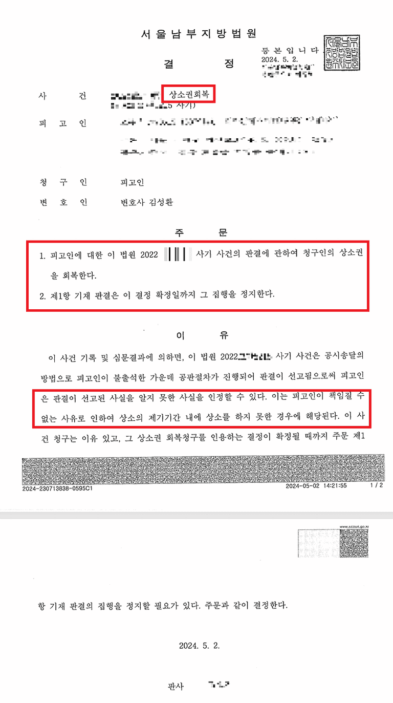 결국 재판부도 전담팀이 주장하는 내용을 받아들여 피고인이 책임질 수 없는 사유로 인하여 상소의 제기기간 내에 상소를 하지 못한 경우에 해당한다며 의뢰인의 상소권회복 청구를 인용하였습니다.