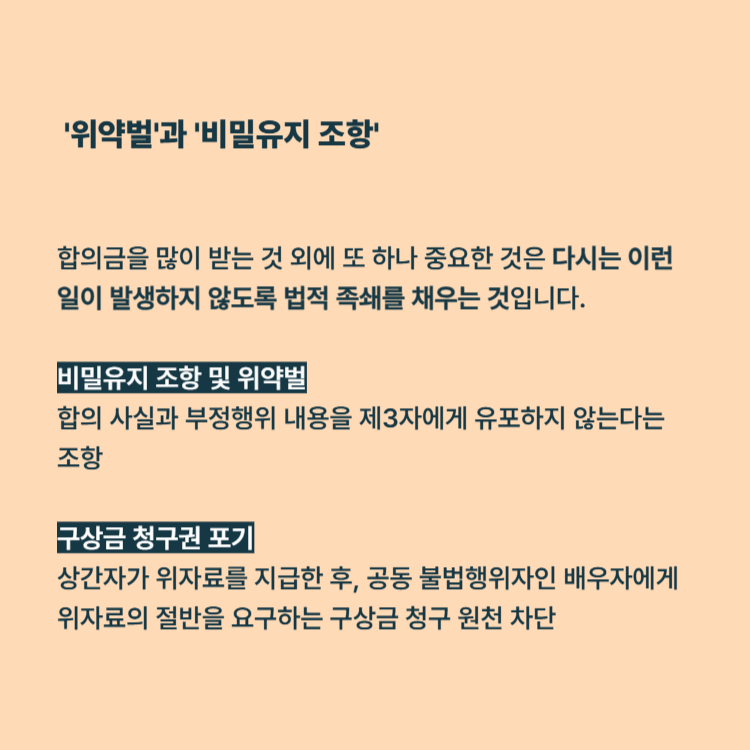 합의 사실과 부정행위 내용을 제3자에게 유포하지 않는다는 조항을 넣었습니다. 만약 B씨가 이를 어길 시, 수령한 합의금의 일부 또는 전액을 위약벌로 배상해야 한다는 강도 높은 조건을 명시했습니다.