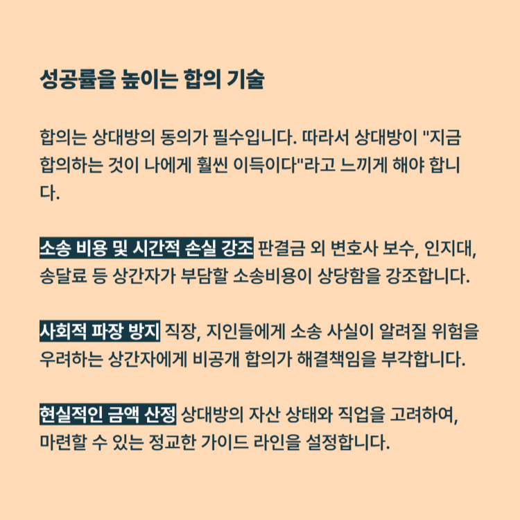 합의는 상대방의 동의가 필수입니다. 무작정 높은 금액을 요구한다고 성사되는 것이 아닙니다. 상대방이 "차라리 소송을 당하고 말지"라고 생각하게 해서는 안 되며, 반대로 "지금 합의하는 것이 나에게 훨씬 이득이다"라고 느끼게 해야 합니다.