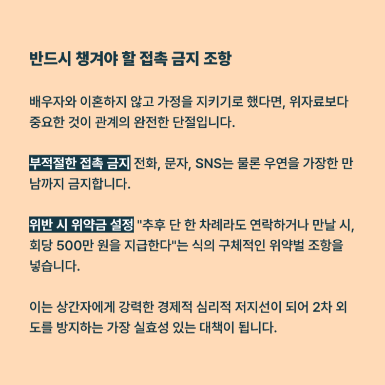 위반 시 위약금 설정: "추후 단 한 차례라도 연락하거나 만날 시, 회당 500만 원을 지급한다"는 식의 구체적인 위약벌 조항을 넣습니다. 이는 상간자에게 강력한 경제적 심리적 저지선이 되어 2차 외도를 방지하는 가장 실효성 있는 대책이 됩니다.