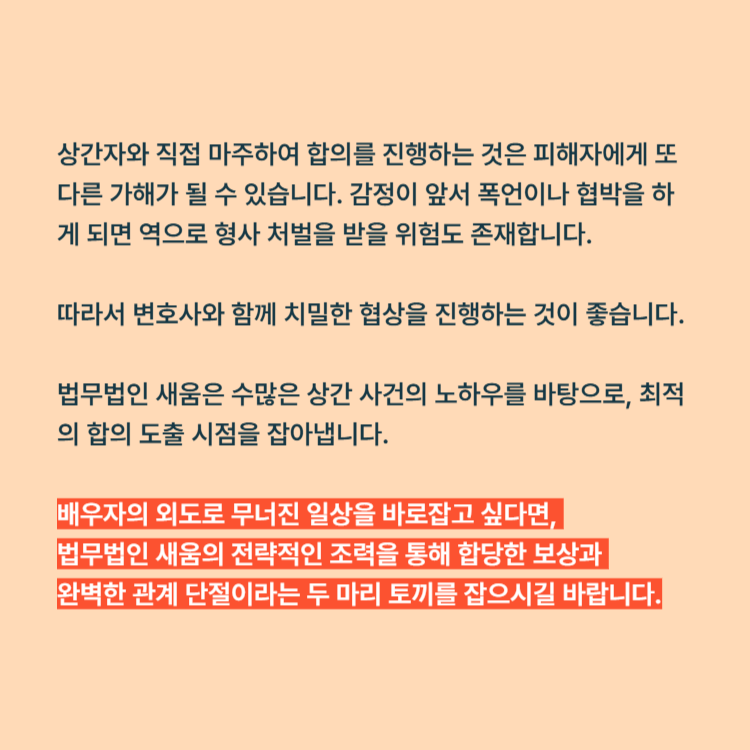 따라서 법률 전문가를 대리인으로 내세워 냉정하고 치밀하게 협상을 진행하는 것이 좋습니다. 법무법인 새움은 수많은 상간 사건의 데이터베이스를 바탕으로, 상대방의 성향을 파악하고 최적의 합의 도출 시점을 잡아냅니다.