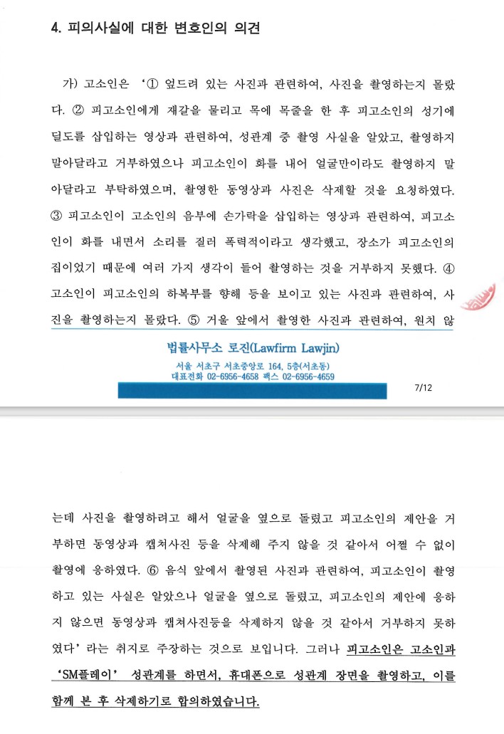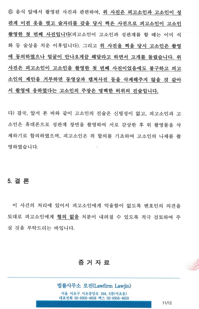 특히 영상에서 상대방이 촬영을 거부하는 듯한 모습을 보이는 경우(얼굴이 촬영되는 것을 피하거나, 촬영을 거절하는 발언을 한 경우)에는 사건 당시의 경위를 최대한 구체적으로 논증하여 상대방이 동의가 있었음을 밝혀내야 합니다. 저희 로펌은 얼굴이 촬영되는 것을 피하는 경우는 물론이고 상대방이 촬영을 거절하는 발언을 한 경우 모두 불송치, 무죄를 각 받아낸 경우가 있습니다. 무죄 판결을 받은 성공사례는 추후 포스팅을 해드리겠습니다. 이번 포스팅은 상대방이 얼굴이 촬영되는 것을 피하는 등 행동이 있었고, 상대방은 의뢰인이 당시 폭력적인 행동을 하여 어쩔수 없이 촬영에 응할 수 밖에 없었다고 주장하면서 고소에 이르게 된 건입니다.