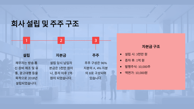 채무자는 방송·통신 장비 제조 및 유통, 광고대행 등을 목적으로 2018년 설립된 회사이다. 납입자본금은 설립시 3천만 원이었으나, 2018년 증자를 통하여 1억 원(보통주 10,000주, 액면 10,000원)으로 증액하였다. 주주는 96%의 주식을 보유한 A와 4%의 주식을 보유한 B로 구성된다.