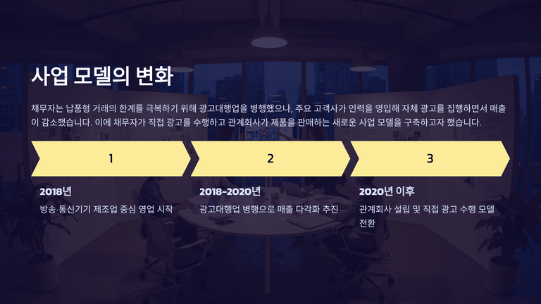 채무자는 방송·통신기기 제조업을 영위하였으나, 납품형 거래의 특성상 거래처·프로젝트가 끊기면 매출이 단절되는 구조였다. 이에 광고대행업을 병행하여 매출을 확대하였지만, 주요 고객사가 채무자 인력을 영입해 자체적으로 광고를 집행하면서 광고대행 매출이 감소하고 핵심 인력이 이탈하여 영업기반이 약화되었다.