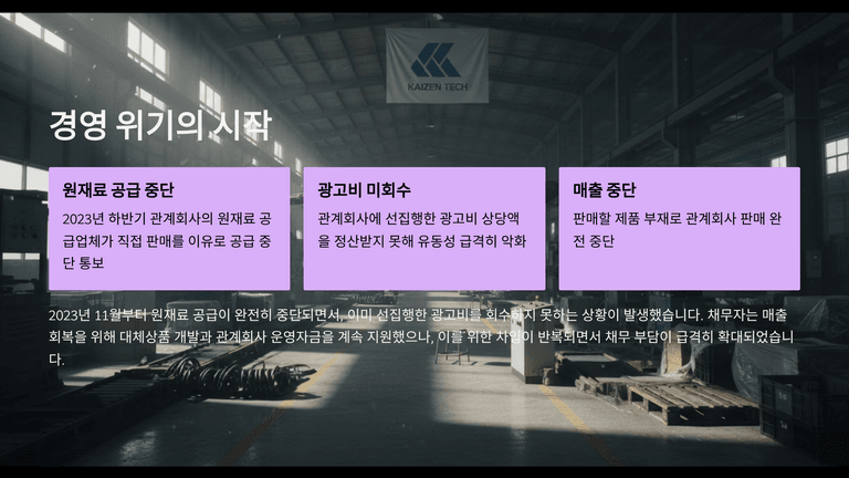 이후 관계회사의 주력제품이 판매되며 매출이 증가하였으나, 해당 제품의 원재료 공급업체가 제품을 직접 판매하겠다는 이유로 2023년 하반기 원재료 공급 중단을 통보하고 2023년 11월부터 공급을 중단하였다. 채무자는 이미 광고를 선집행한 상태였으나 판매할 제품이 없어 관계회사 판매가 중단되었고, 그 결과 광고비 상당액을 정산받지 못하여 유동성이 급격히 악화하였다.