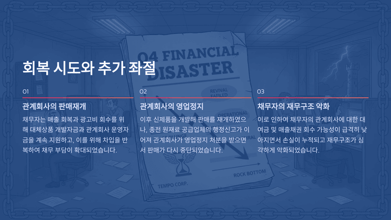 채무자는 매출 회복과 광고비 회수를 위해 대체상품 개발자금과 관계회사 운영자금을 계속 지원하고, 이를 위해 차입을 반복하여 채무 부담이 확대되었다. 이후 신제품을 개발해 판매를 재개하였으나, 종전 원재료 공급업체의 행정신고가 이어져 관계회사가 영업정지 처분을 받으면서 판매가 다시 중단되고 매출 회복이 좌절된다.