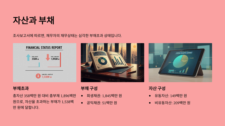 조사보고서상 재산상태 조사결과, 총자산은 358백만 여원, 총부채는 1,896백만 여원이고, 자산을 초과하는 부채초과액은 1,538백만 여원에 이른다.