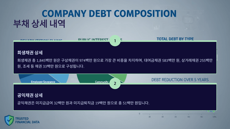 부채는 회생채권 1,845백만 여원과 공익채권 51백만 여원으로 구성된다.