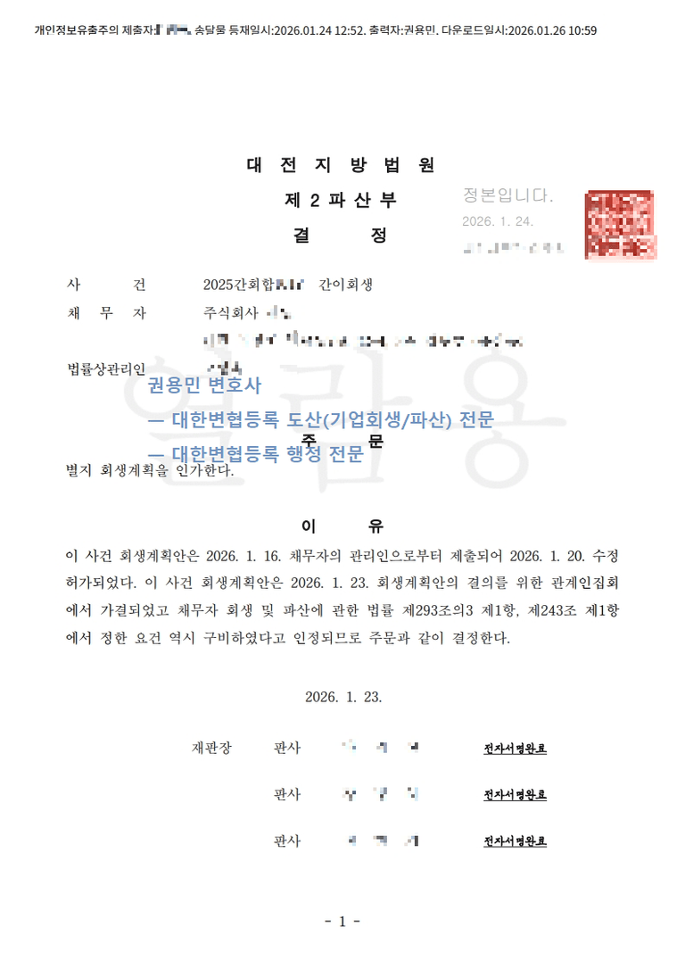 2026. 01. 23. 법인간이회생인가 - 대전지방법원