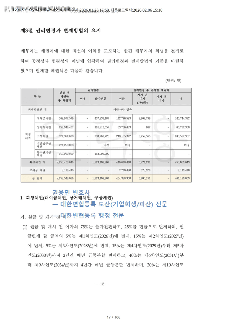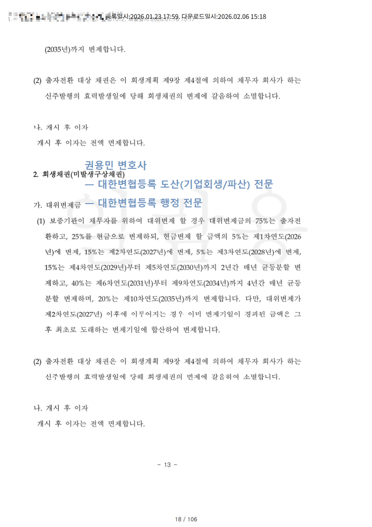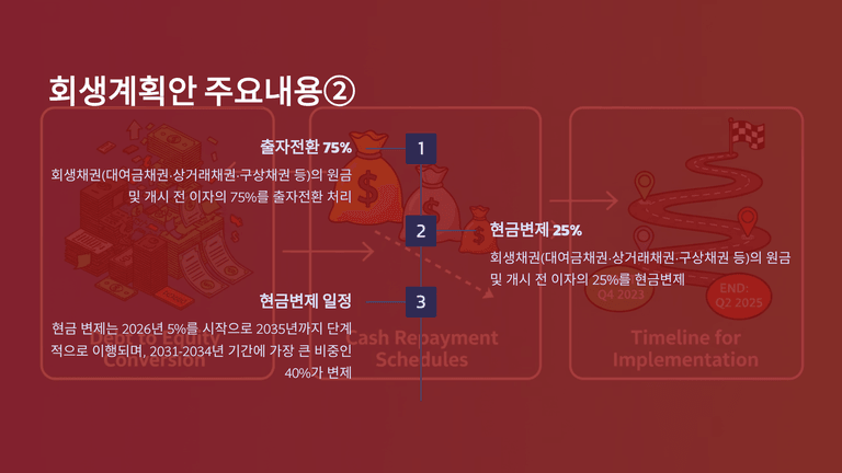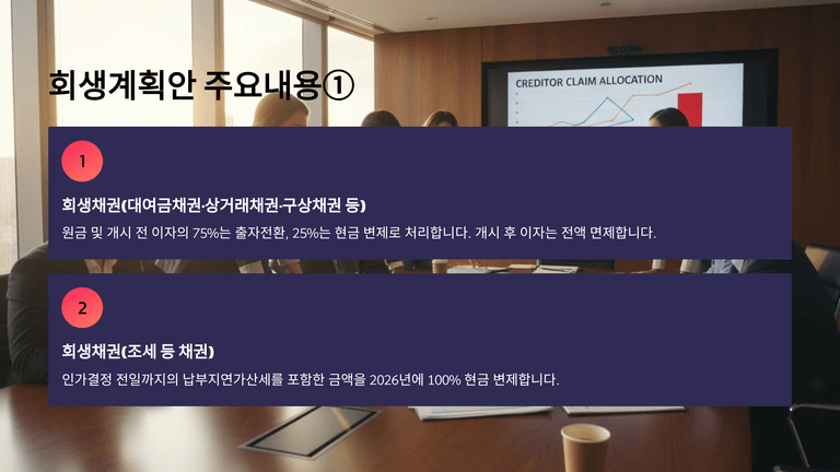 회생채권(대여금채권·상거래채권·구상채권 등)에 대하여 원금 및 개시 전 이자의 75%는 출자전환, 25%는 현금 변제로 처리한다. 개시 후 이자는 전액 면제한다. 현금변제(25%)는 2026년 5%, 2027년 15%, 2028년 5%, 2029~2030년 합계 15%(연균등), 2023년~2034년 합계 40%(연균등), 2035년 20%의 일정으로 이행한다.