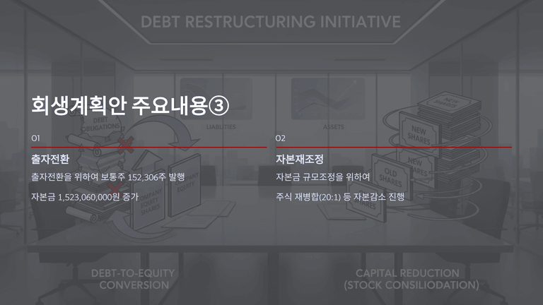회생채권 출자전환을 위하여 보통주(액면 10,000원, 발행가 10,000원) 152,306주를 발행하여 자본금을 1,523,060,000원 증가시키고, 그만큼 부채를 감소시킨다. 출자전환 후에는 자본금 규모 조정을 위해 주식 재병합(20:1) 등 자본감소 절차를 진행한다.