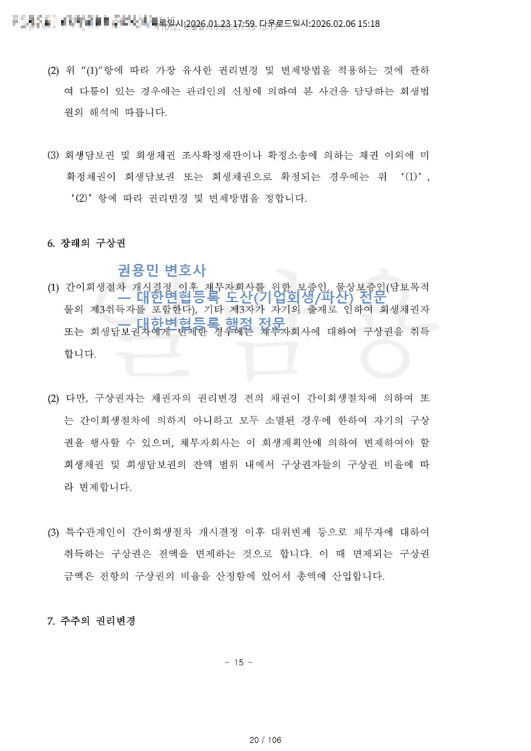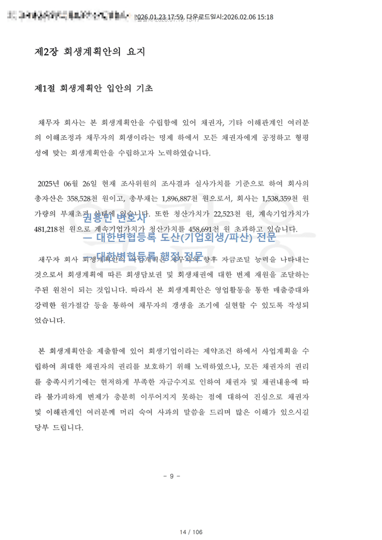 회생계획안은 청산가치 22백만 여원, 계속기업가치 481백만 여원으로 계속기업가치가 청산가치를 초과하는 것을 전제로 권리변경 및 변제계획을 설계하였다.