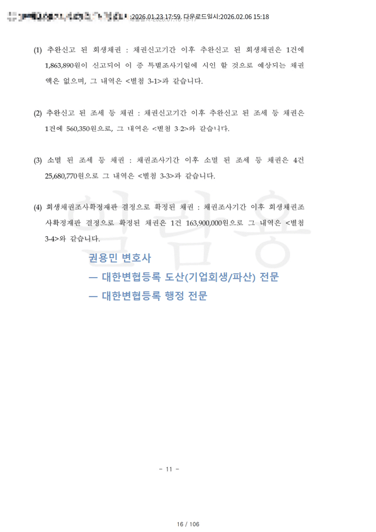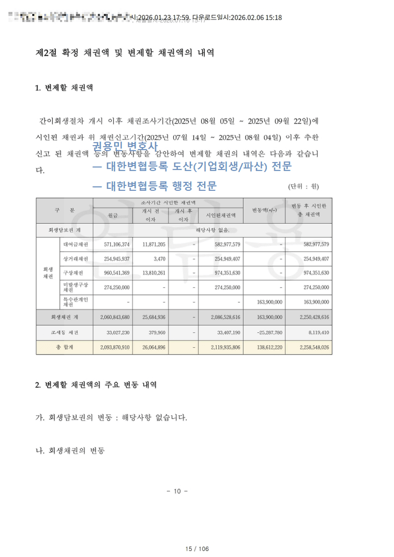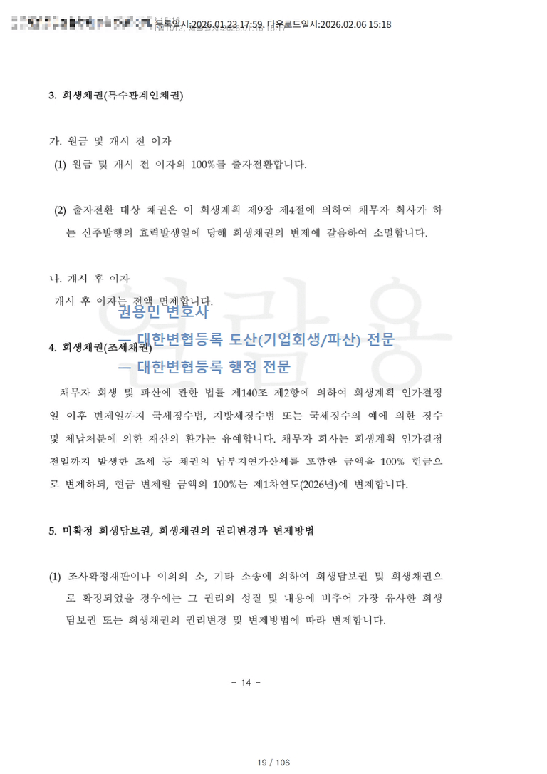 회생채권 중 조세 등 채권은 인가결정 전일까지의 납부지연가산세를 포함한 금액을 2026년에 100% 현금 변제한다.