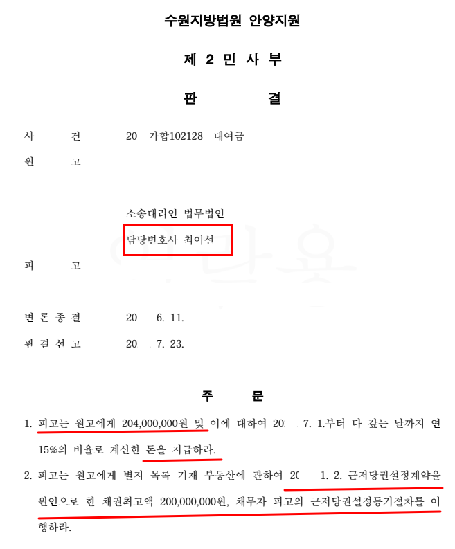 결국 재판부는 저희 측의 주장을 모두 인정하였습니다. 상대방의 억지 주장을 배척하고, 의뢰인에게 남은 원금 전액과 연 15%의 높은 지연손해금을 지급하라는 판결은 물론, 약속했던 부동산에 근저당권설정등기를 이행하라는 완벽한 승소 판결을 이끌어냈습니다.