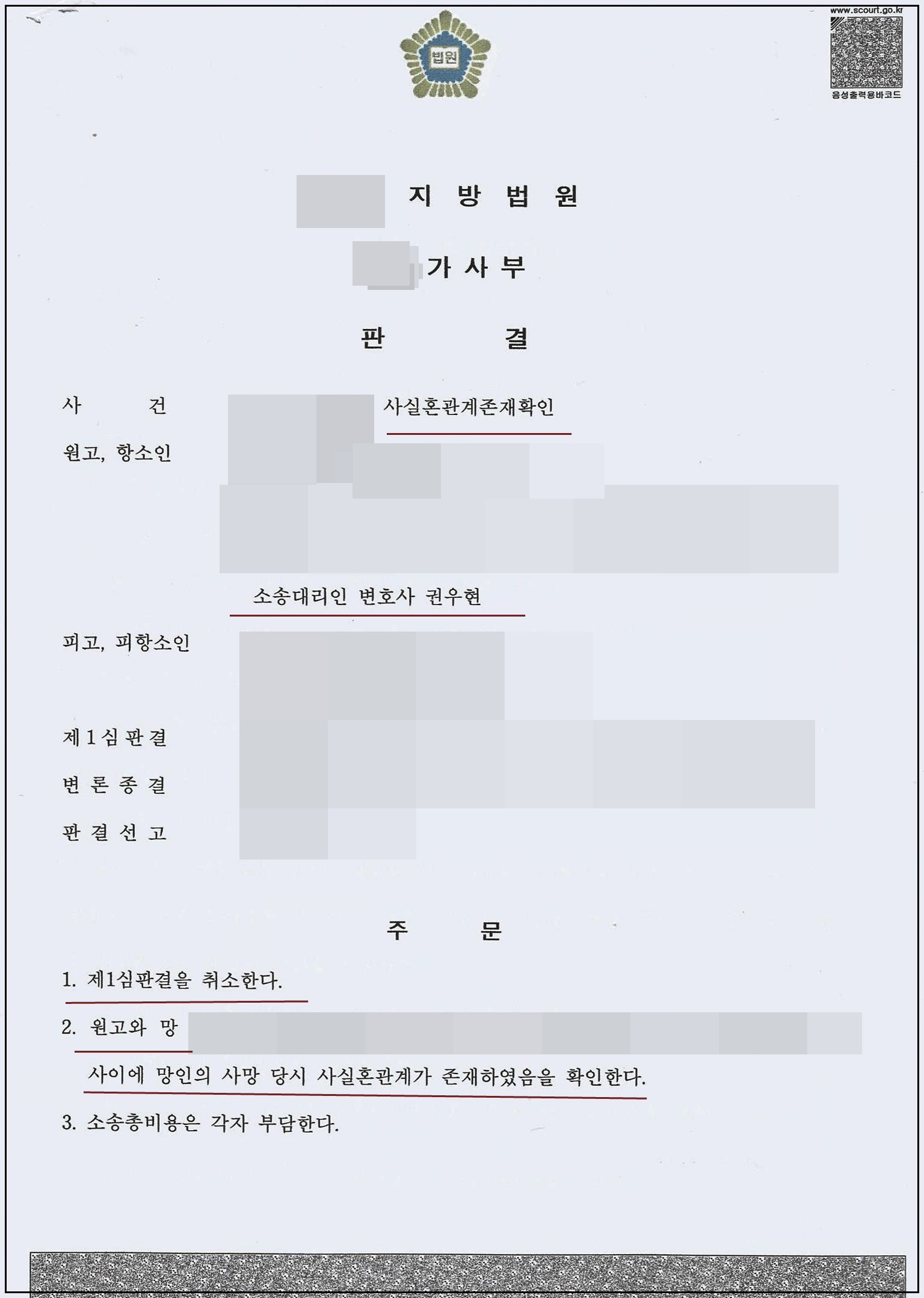 7. 그러나 과거의 중혼적 사실혼이라 하더라도 망인이 법률혼배우자와 사실상 이혼상태에 있었던 경우 등에는 사실혼으로서 보호된다는 점과 사실혼배우자가 주택임차권을 승계하는 경우 주택임대차보증금반환채권에 대한 상속권까지 가질 수 있다는 학설(지원림 민법강의) 및 주택임차권을 승계한 사실혼배우자에게 상속권을 인정한 항소심판례를 구체적으로 언급, 설득하여, 결국 사망자 상대의 중혼적사실혼에 대한 모든 선입견을 뒤집고 원고 승소판결을 받을 수 있었습니다(망자와의 중혼적사실혼관계존재확인의 소 승소)