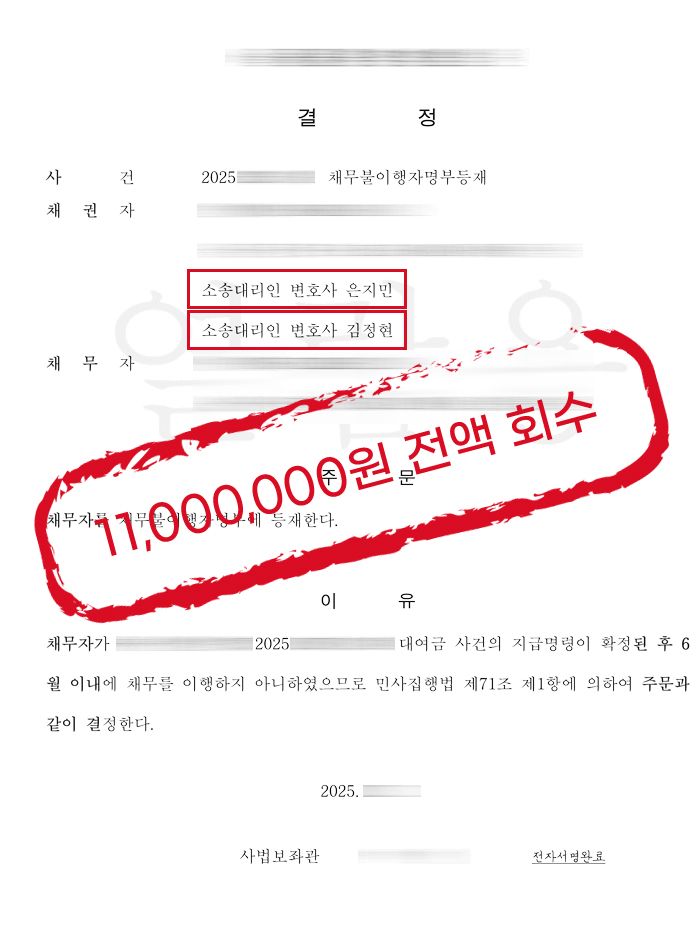 법률사무소 청안은 지급명령 결정문을 받은 후 신속히 신용조회를 통해 자산 현황과 집행가능성을 확인 후 채권압류를 진행하였습니다. 채권압류 후에도 채무자에게 채권금액을 모두 회수되지 않아 동시에 채무자에게 내용증명을 발송 및 지급명령 결정문 받은지 6개월이 경과하여 채무불이행자명부등재 신청을 하여 법적 조치를 강화하였습니다.