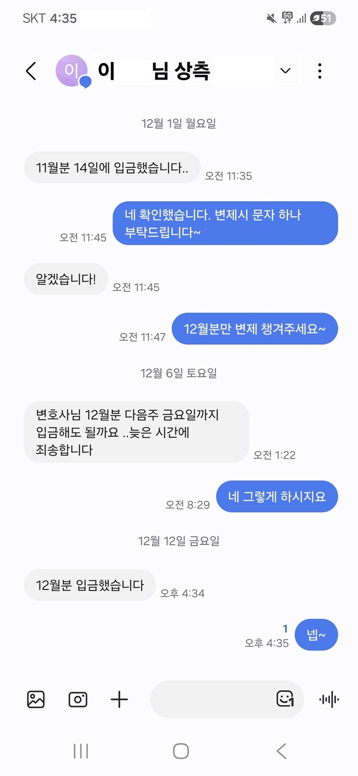 채무불이행자명부등재 절차가 완료된 이후, 채무자는 변제 의사를 밝히며 법률사무소 청안 측으로 연락을 해왔습니다. 이후 협의를 통해 변제 일정이 구체화되었고, 그 결과 이번 12월을 마지막으로 채권 전액에 대한 변제가 모두 완료되
