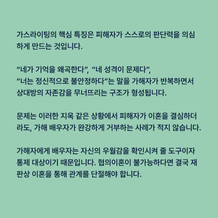 문제는 이러한 지옥 같은 상황에서 피해자가 이혼을 결심하더라도, 가해 배우자가 완강하게 거부하는 사례가 적지 않다는 점입니다. 가스라이팅 가해자에게 배우자는 자신의 우월감을 확인시켜 줄 도구이자 통제 대상이기 때문입니다. 협의이혼이 불가능하다면 결국 재판상 이혼을 통해 관계를 단절해야 합니다.
