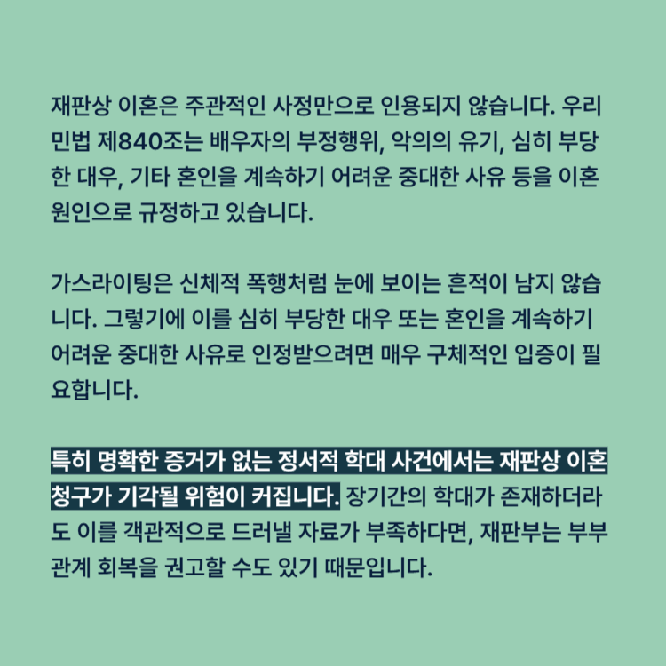 특히 명확한 외도나 폭행 증거가 없는 정서적 학대 사건에서는 재판상 이혼 청구가 기각될 위험이 쟁점이 됩니다. 장기간의 학대가 존재하더라도 이를 객관적으로 드러낼 자료가 부족하다면, 재판부는 이를 단순한 성격 불합치로 보아 부부 관계 회복을 권고할 수도 있기 때문입니다.