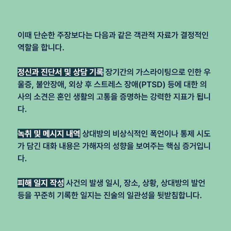 정신과 진단서 및 상담 기록 장기간의 가스라이팅으로 인한 우울증, 불안장애, 외상 후 스트레스 장애(PTSD) 등에 대한 의사의 소견은 혼인 생활의 고통을 증명하는 강력한 지표가 됩니다.