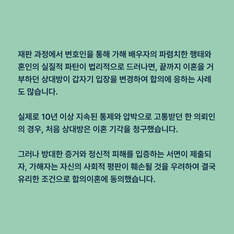 실제로 10년 이상 지속된 통제와 압박으로 고통받던 한 의뢰인의 경우, 처음에는 상대방이 "나는 잘못이 없다"며 이혼 기각을 청구했습니다. 그러나 우리가 수집한 방대한 증거와 정신적 피해를 입증하는 서면이 제출되자, 가해자는 자신의 사회적 평판이 훼손될 것을 우려하여 결국 유리한 조건으로 합의이혼에 동의했습니다.