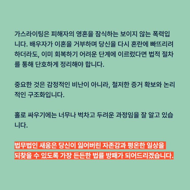 가스라이팅은 피해자의 영혼을 잠식하는 보이지 않는 폭력입니다. 배우자가 이혼을 거부하며 당신을 다시 혼란에 빠뜨리려 하더라도, 이미 회복하기 어려운 단계에 이르렀다면 법적 절차를 통해 단호하게 정리해야 합니다.