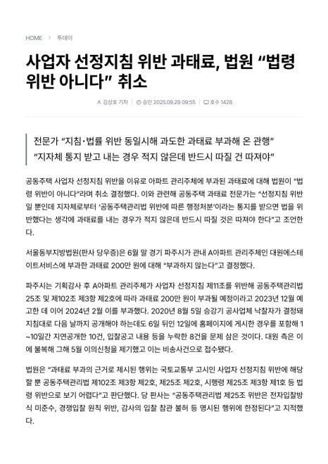 최근 한국아파트신문과의 인터뷰를 통해 제가 자문했던 공동주택 사건이 '과태료 부과 처분 취소'라는 긍정적인 결정으로 이어진 소식을 전하게 되었습니다. 주민들의 삶과 직결된 법적 분쟁에서 실질적인 해결책을 제시하고 그 결과를 직접 공유할 수 있다는 점은 변호사로서 무엇보다 큰 보람이자 기쁨입니다.