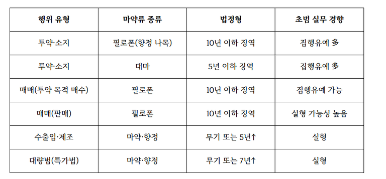 엄중한 잣대가 적용됩니다. 마약의 종류(대마, 필로폰, 케타민, LSD 등)와 행위의 종류(단순 소지, 투약, 매수,