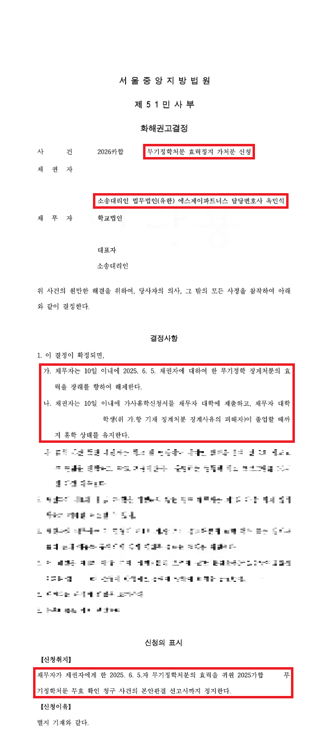 무기정학처분 취소 소송을 제기하는 한편 무기정학처분 효력정지 가처분 신청을 한 결과 징계처분에 대해서는 자율권을 존중하여 가처분 신청을 기각하는 경향을 이겨내고 무기정학처분의 효력을 장래를 향하여 해제하는 내용의 화해권고결정을 받음으로써 신분상, 재산상 중대한 불이익에서 벗어날 수 있었습니다.