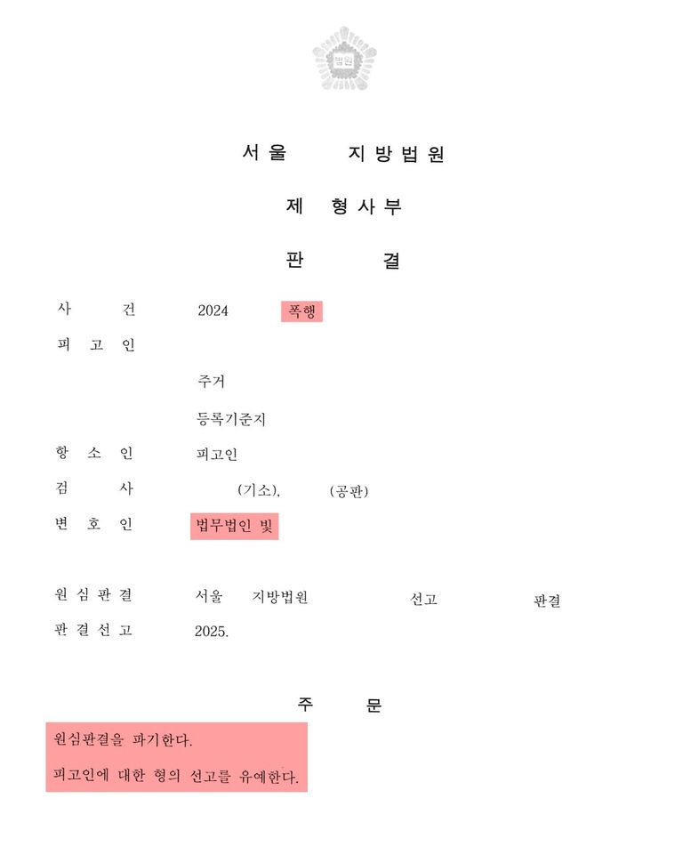 항소심을 맡은 법무법인 빛은 단순 폭행이 아닌, 이웃 간에 주차 문제로 시작된 말다툼이